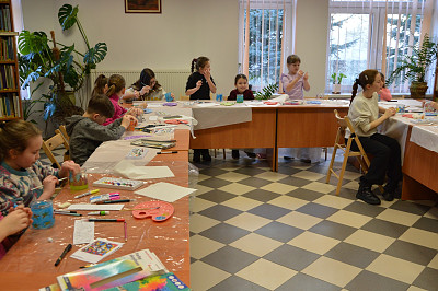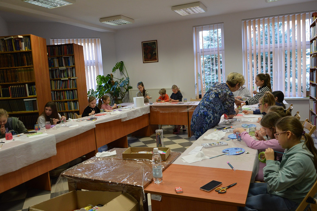 Nie zabrakło również zajęć plastycznych, podczas których pod kierunkiem plastyczki Wiesławy Frączek uczestnicy poznali tajniki malowania na szkle. W efekcie zajęć powstały oryginalne witrażowe lampiony, które można było zabrać do domu.