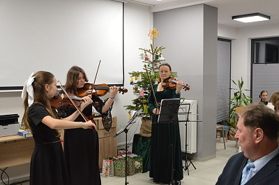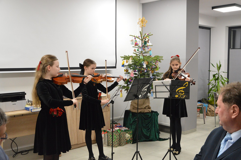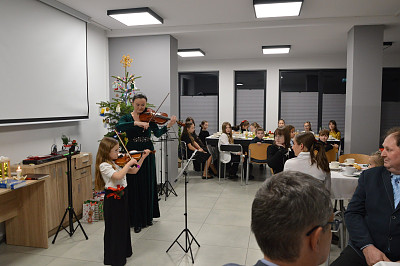W świąteczny klimat wprowadziły zebranych uczennice Szkoły Muzycznej w Tymbarku: Lena Czernek, Antonina Grzegorzek, Antonina Burek, Anna Surdziel, Blanka Młynarczyk, Zuzanna Miśkowiec, Anna Twaróg i Antonina Ślezak z klasy skrzypiec Magdaleny Kamińskiej, prezentując najpiękniejsze kolędy.