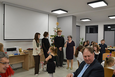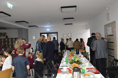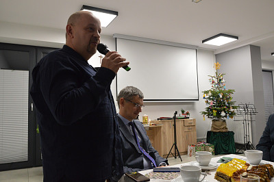 Po krótkim powitaniu przez kierownika biblioteki, zabrał głos wójt Paweł Ptaszek, złożył wszystkim mieszkańcom życzenia świąteczne, do których przyłączyli się radni: Zbigniew Hojnor i Marek Twaróg. Z uwagą wysłuchaliśmy recytacji wiersza Andrzeja Pacuły „Kolęda życzliwa” w interpretacji Tobiasza i Mateusza Rysiów. Przed wspólną wieczerzą Tobiasz przeczytał fragment Pisma Świętego „Z narodzeniem Jezusa…”, po czym wszyscy składali sobie życzenia łamiąc się opłatkiem. Na wigilijnym stole nie zabrakło tradycyjnych potraw: krokietów z kapustą i grzybami, barszczu, pierogów, ciast, sałatek, owoców i przekąsek.