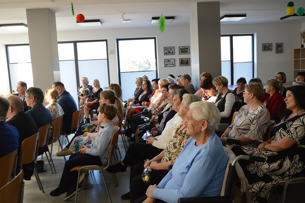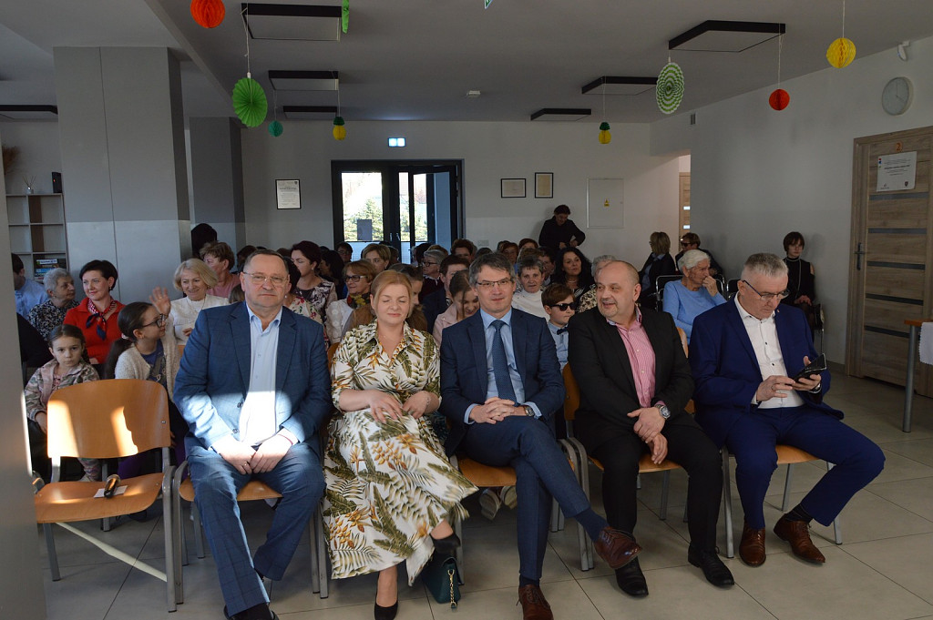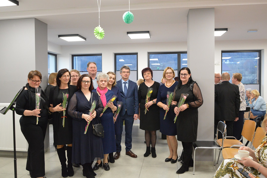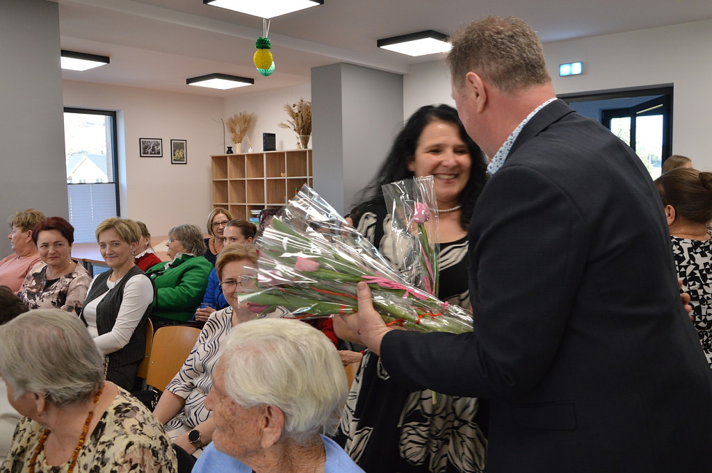 Spotkanie rozpoczęła kierownik biblioteki a nastęnie dzieci uczęszczające na zajęcia świetlicowe: Oliwia Mroczek-Kurzawa i Mateusz Ryś, prezentując wierszowaną scenką poświęconą kobietom. Przybyłych przywitał i złożył życzenia wójt Paweł Ptaszek oraz radni: Zbigniew Hojnor i Marek Twaróg. Do życzeń przyłączyli się radni powiatowi Czesław Kawalec i Leszek Król, dedykując wszystkim kobitom - śpiewająco „sto lat”. Kolejny elementem było wręczenie przez gospodarza i radnych symbolicznych tulipanów oraz słodyczy wszystkim paniom.