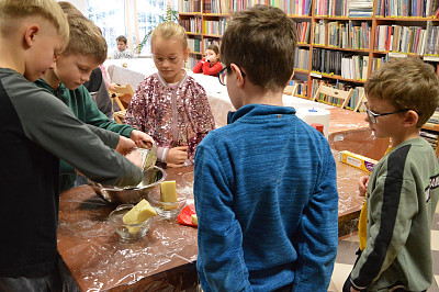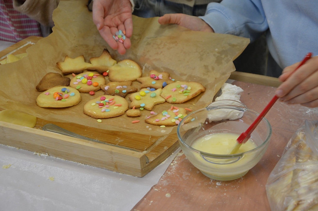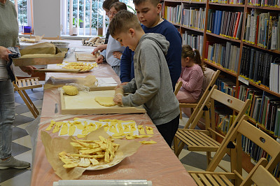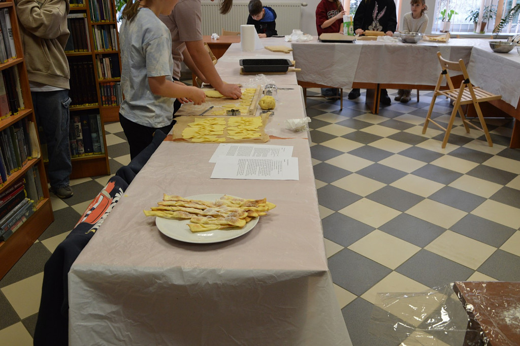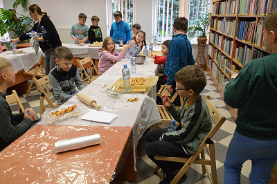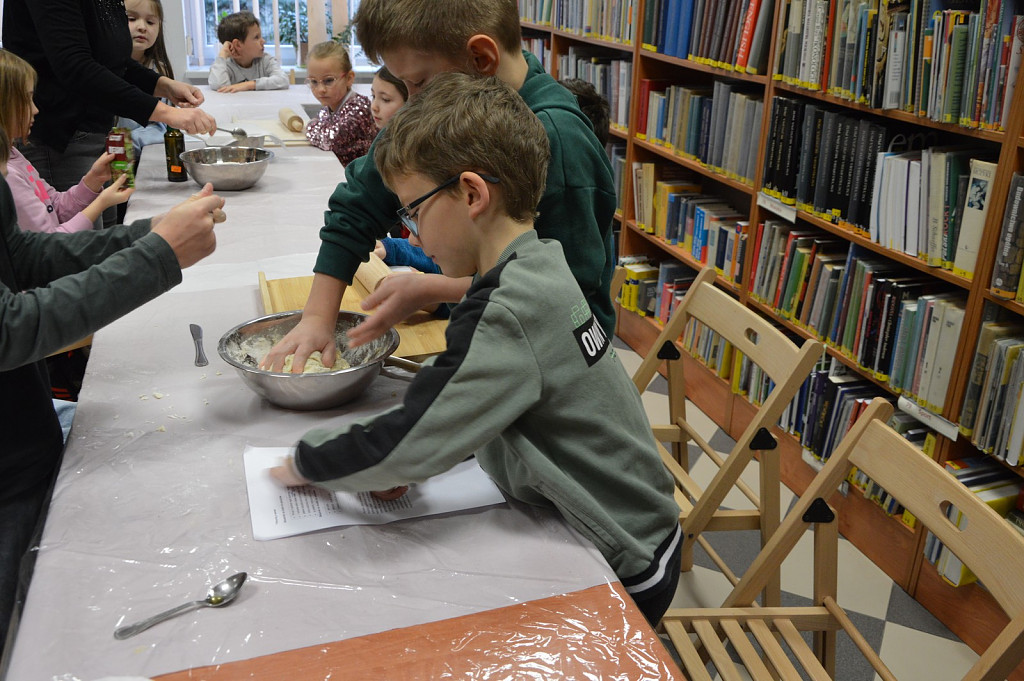 Miłośnicy zajęć kulinarnych poznali zasady przygotowania smacznych wypieków. Nauczyli się, zgodnie z przepisem wyrabiać cisto drożdżowe w efekcie czego powstały pizzowe paluchy. Tuż przed tłustym czwartkiem młodzi kucharze przygotowały faworki oraz maślane ciasteczka z lukrem pomarańczowym.