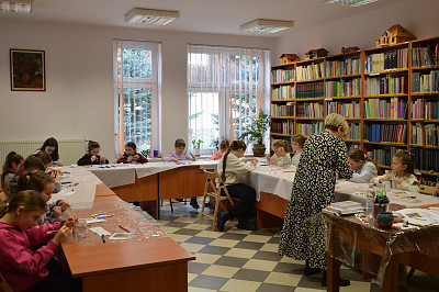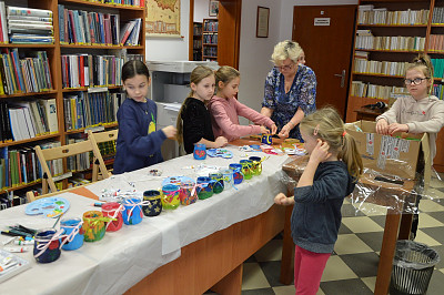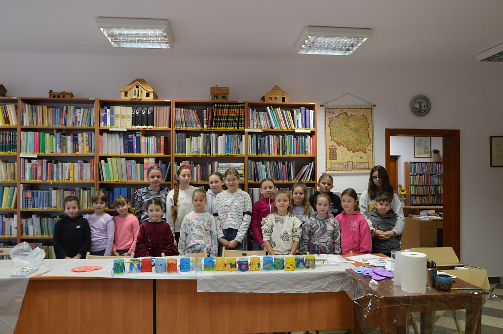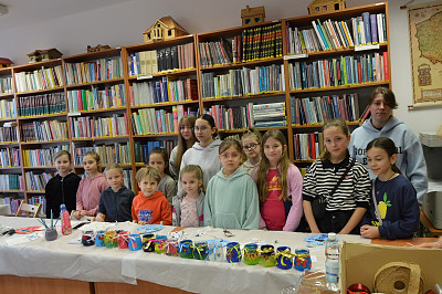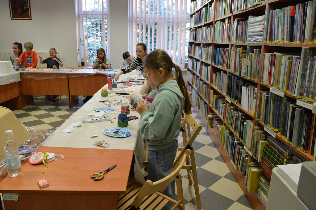 Nie zabrakło również zajęć plastycznych, podczas których pod kierunkiem plastyczki Wiesławy Frączek uczestnicy poznali tajniki malowania na szkle. W efekcie zajęć powstały oryginalne witrażowe lampiony, które można było zabrać do domu.