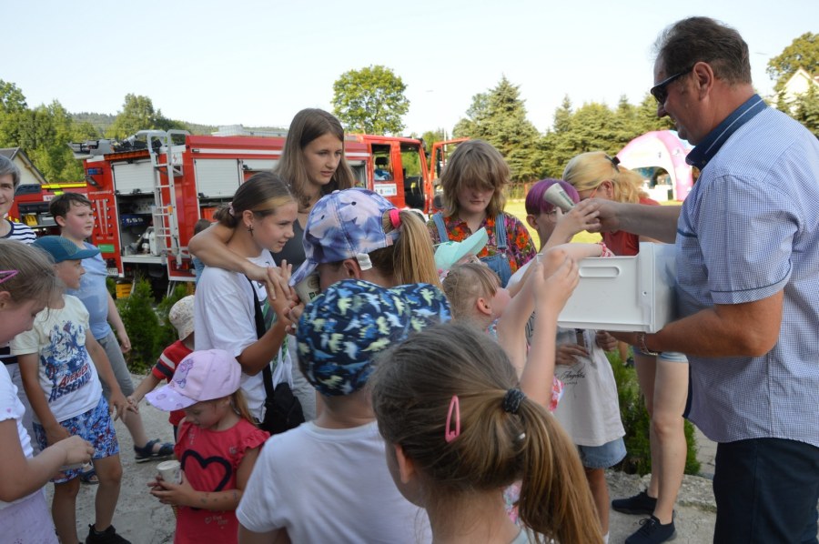 Spore emocje towarzyszyły przy oglądaniu pokazowej akcji gaśniczej przygotowanej przez druhów z OSP Tymbark. Obejmował on pokaz radzenia sobie z płonącym olejem na patelni, czy też gaszenie objętej ogniem butli gazowej.