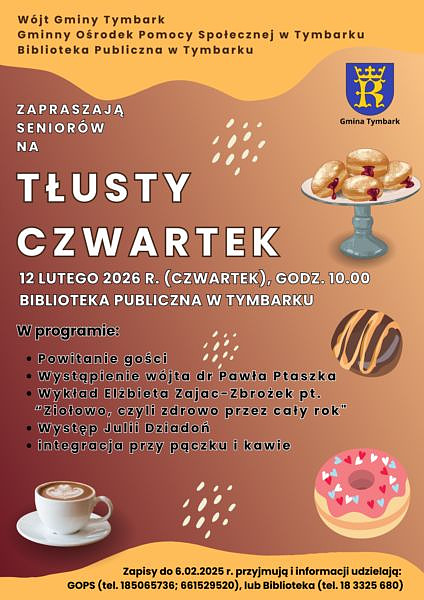 Serdecznie zapraszamy seniorów z terenu gminy na spotkanie tłustoczwartkowe w bibliotece 12 lutego 2026 r.