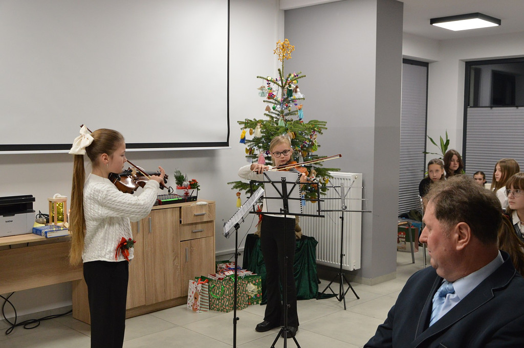 W świąteczny klimat wprowadziły zebranych uczennice Szkoły Muzycznej w Tymbarku: Lena Czernek, Antonina Grzegorzek, Antonina Burek, Anna Surdziel, Blanka Młynarczyk, Zuzanna Miśkowiec, Anna Twaróg i Antonina Ślezak z klasy skrzypiec Magdaleny Kamińskiej, prezentując najpiękniejsze kolędy.